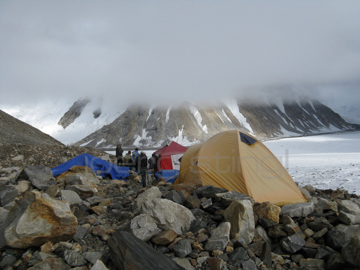 Nach wenigen Tagen bereits gelang es uns bis über die Wandmitte vorzudringen und unter einer Eiswulst ein Depot zu errichten, das wir später noch zu Camp2 ausbauten. Von hier aus wollten wir im alpinen Stil zum Gipfel gehen, aber ein plötzlicher Wettersturz verhinderte den Aufstieg am nächsten Morgen. Die Sicht war durch den Schneefall derart eingeschränkt, dass wir umkehren mussten. Von nun an hielt uns das Schlechtwetter zwei Wochen im Basislager fest. Daran änderten auch die gelegentlichen und sehr kurzen Aufheiterungen nichts.