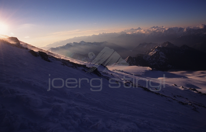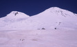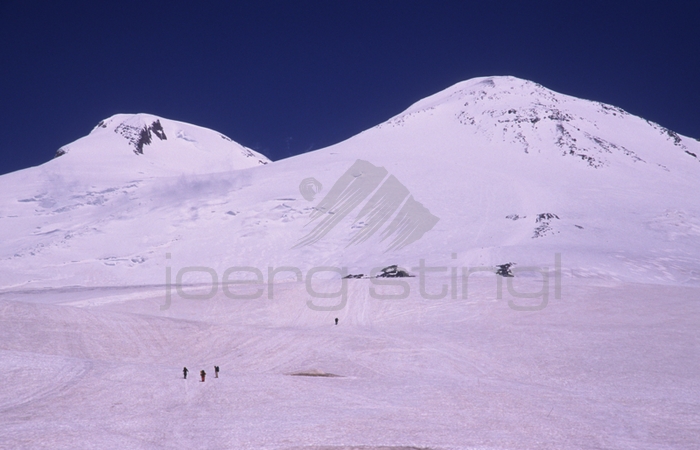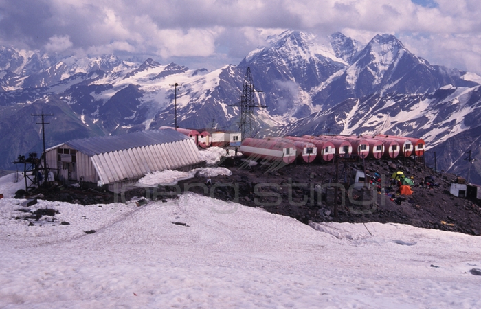 Überraschung beim Aufstieg Nach einigen Tagen Akklimatisation am Elbrus und den umliegenden Bergen, wagten wir den Aufstieg in die Flanken des erloschenen Vulkans mit den zwei Gipfeln. Als Lager nutzten wir allerdings nicht das "Prijut 11", dem nach mehreren Bränden eine neu erbaute Schutzhütte in miserablem Zustand gefolgt ist, sondern wir stellten unser Zelt einige Meter weiter oberhalb auf, um dem Andrang in der völlig überfüllten Hütte zu entgehen. Trotz frostiger Nacht in 4300m Höhe, konnten wir so ausgeruht bei klarem Wetter um fünf Uhr morgens zum Gipfel aufbrechen. Ein wenig überrascht waren wir schon, als höllischer Motorenlärm die morgendliche Stille unterbrach und uns ein arktisches Schneemobil überholte. Gegen Gebühr ließen sich einige Touristen bis zu den 4800m hoch gelegenen Pasturov Felsen fahren. Wenig später hüllten uns dann schon die Wolken ein und wir hatten Mühe den Weg bis in den Sattel zwischen beiden Gipfeln zu finden. Im Tagesverlauf verzogen sich jedoch die Wolkenschleier wieder und wir erreichten nach einiger Anstrengung und guter Sicht gegen 14 Uhr den 5642m hohen Westgipfel. Nach einem eiligen Abstieg packten wir sofort das Zelt zusammen und nahmen die letzte Seilbahn, die uns am selben Abend zum bereits vorbestellten russischen Borschtsch brachte. |