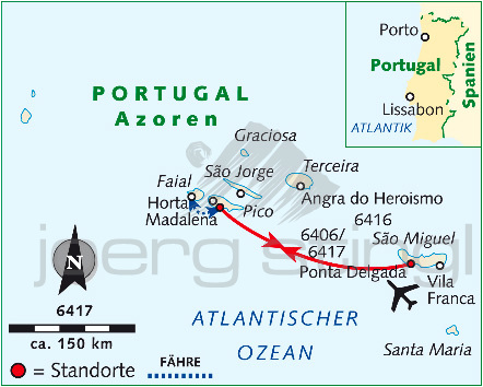 Die neun bewohnten Inseln des Azoren Archipels bilden den westlichsten Teil Europas und liegen ca. 1800km vor der Küste Portugals. Nur ein Eiland, Santa Maria, ist nicht vulkanischen Ursprungs, sondern sedimentär.
