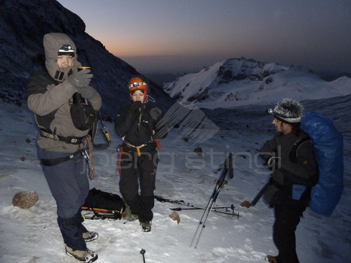 In den ersten Morgenstunden brechen wir in Richtung Gipfel auf. Über den Gletscher führt der Aufstieg zunächst durch die Dunkelheit, bis bei Sonnenaufgang ein beeindruckendes Panorama auf den Kaukasus sichtbar wird. Ein letztes Steilstück über eisige Passagen ist der Schlüssel zum Gipfel, den wir nach ca. 8h am Vormittag erreichen. Je nach Wetterbedingungen, verweilen wir zum Ausruhen recht lange, bis der Abstieg all unsere Aufmerksamkeit fordert. Übernachtung in der Meteo Station (F/M/A)